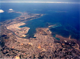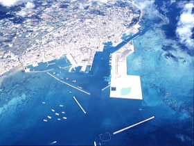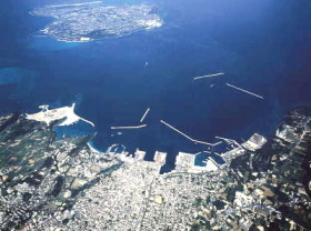 | 勝連半島、津堅島、久高島及び知念半島を結ぶ24,000ヘクタールの広大な海域を有する中城湾港は、昭和57年の第2次沖縄振興開発計画に沖縄経済の自立的発展を支える一大プロジェクトとして位置づけられた。平成13年度は静穏度確保のための防波堤(東)や航路泊地(−11.0m)の付帯施設である泡瀬地区土砂処分場の整備を行うこととしている。 |