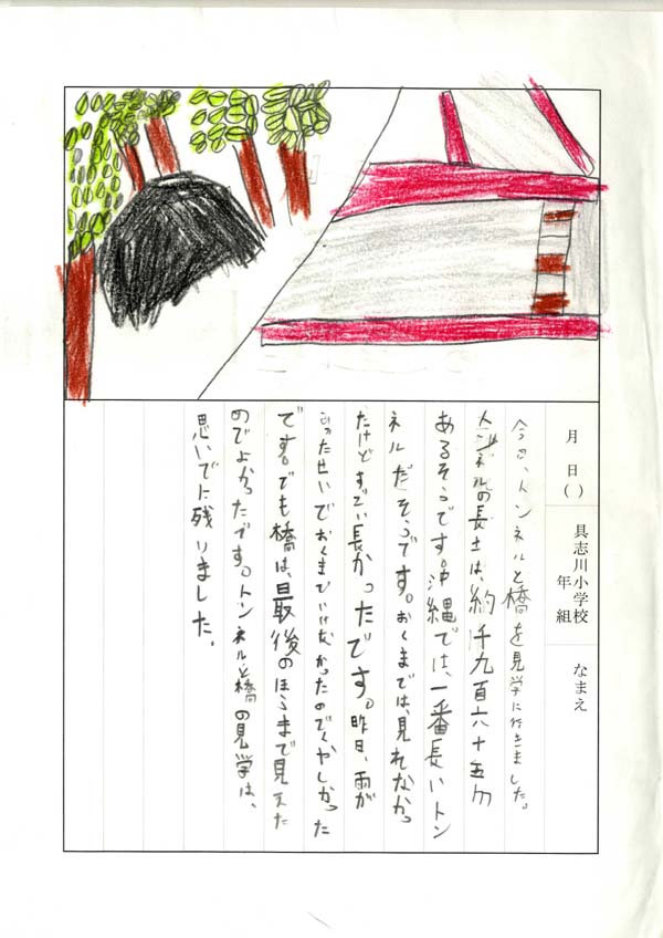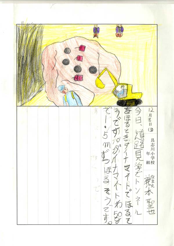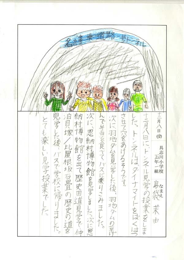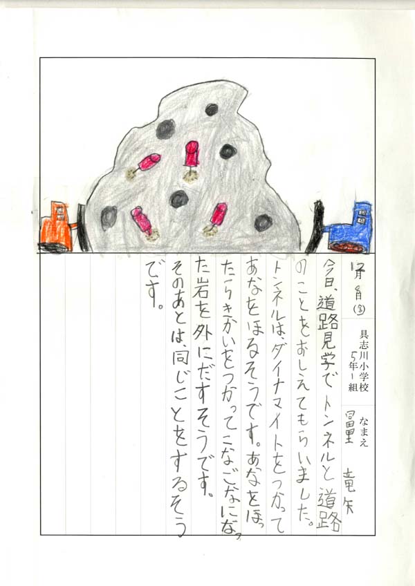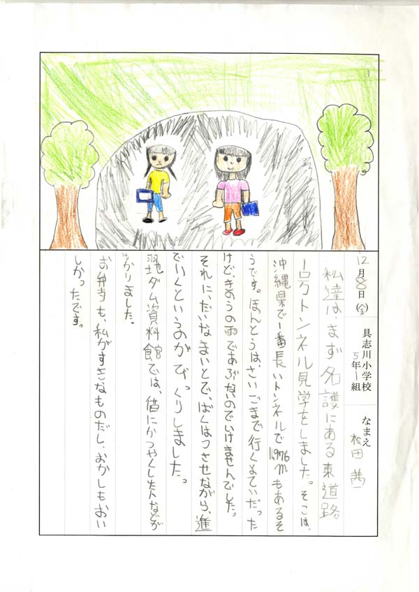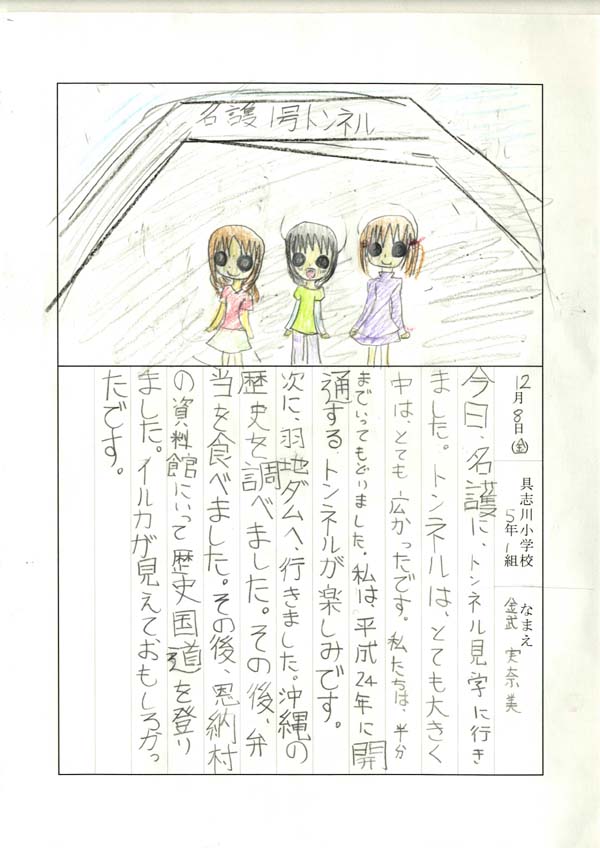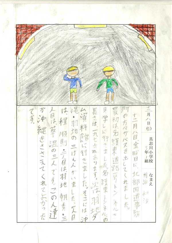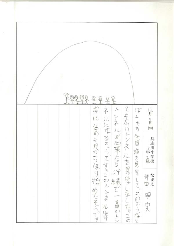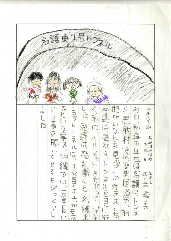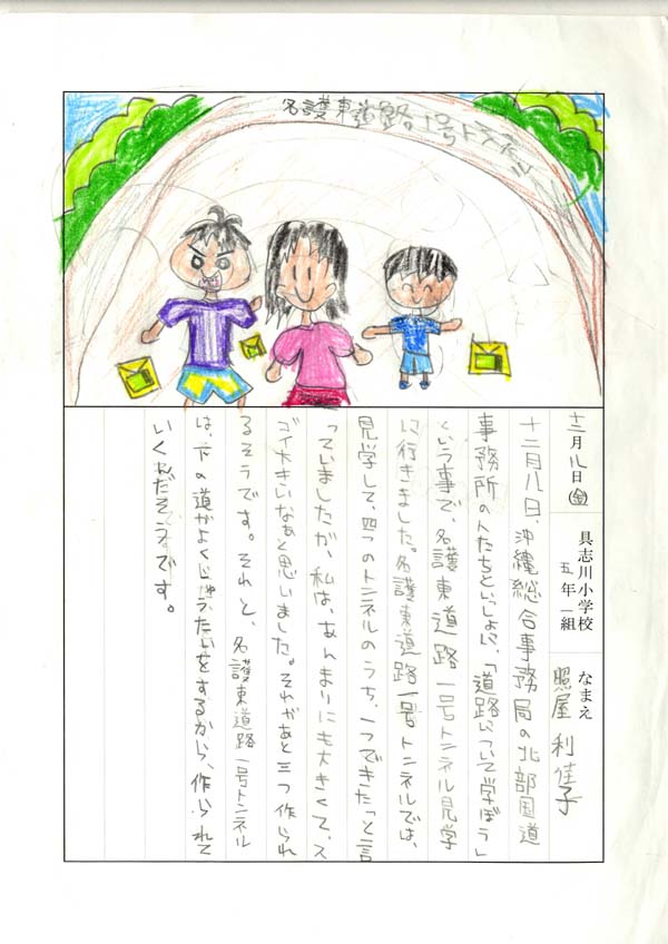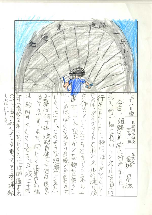 具志川小学校のみなさん、楽しい絵日記をありがとうございました!みんな、それぞれ心に残ったことは違いますが、やっぱり「名護東道路1号トンネル」の絵を書いてくれているお友達が、1番多いですね!みんなが大人になる頃に完成するトンネルです。大人になって完成したトンネルを車で走りながら、この見学会のことを思い出してくれたら、うれしいですね。