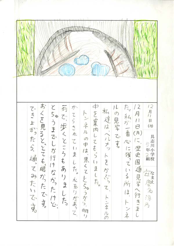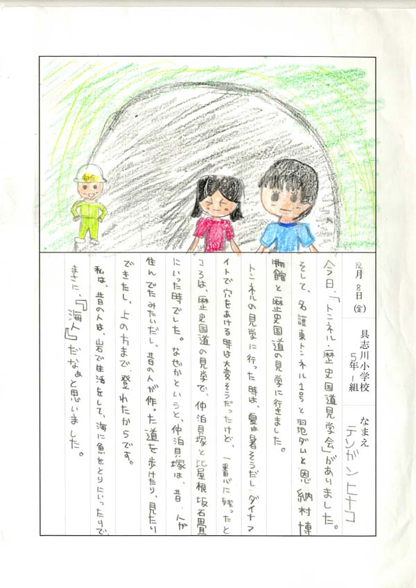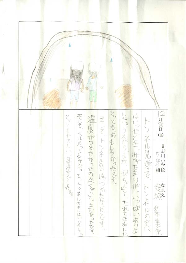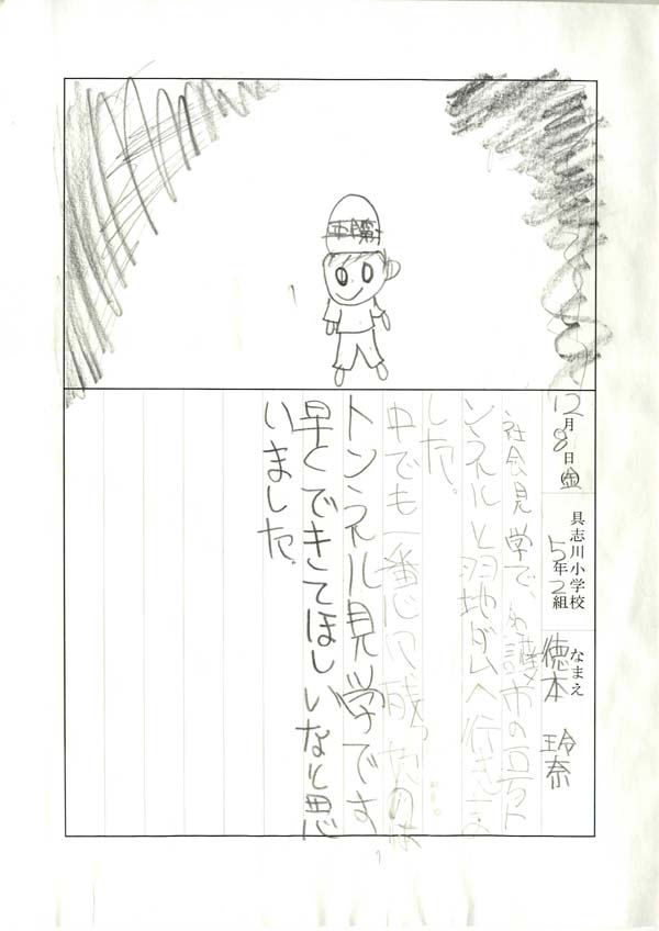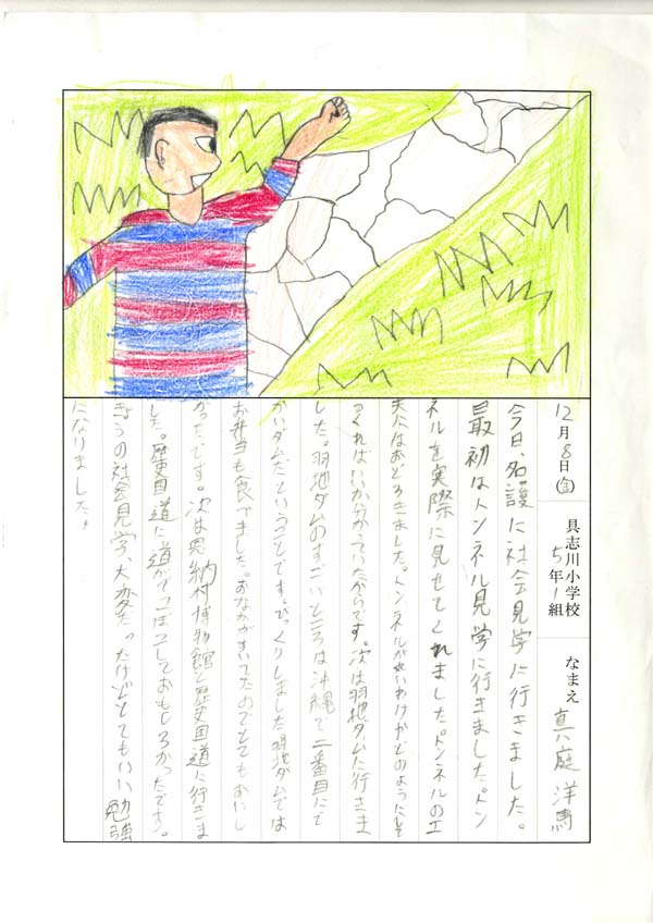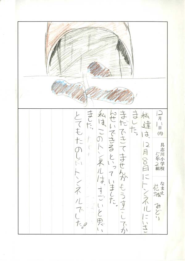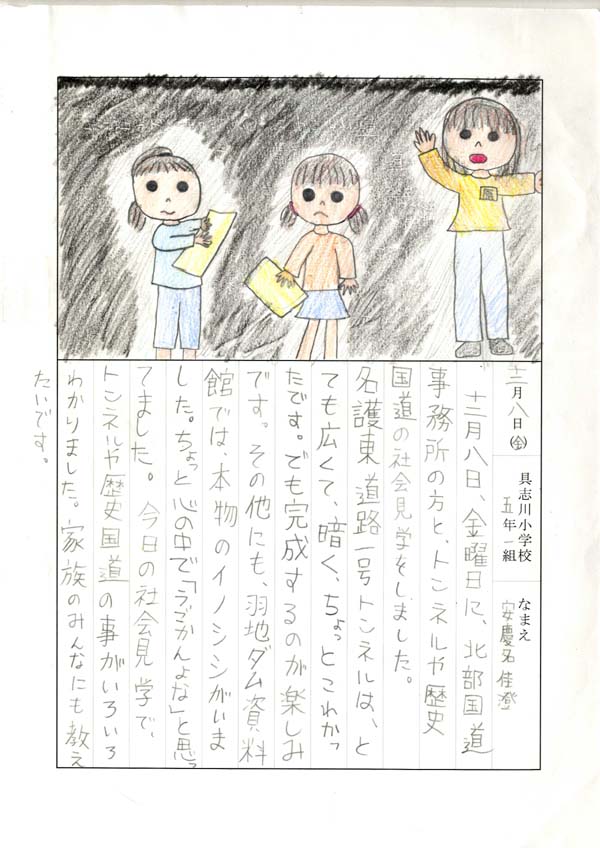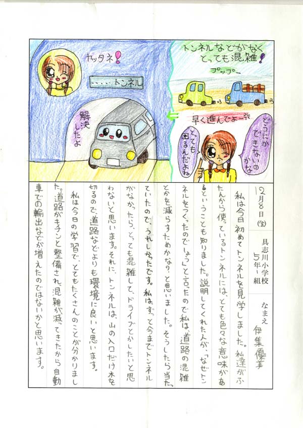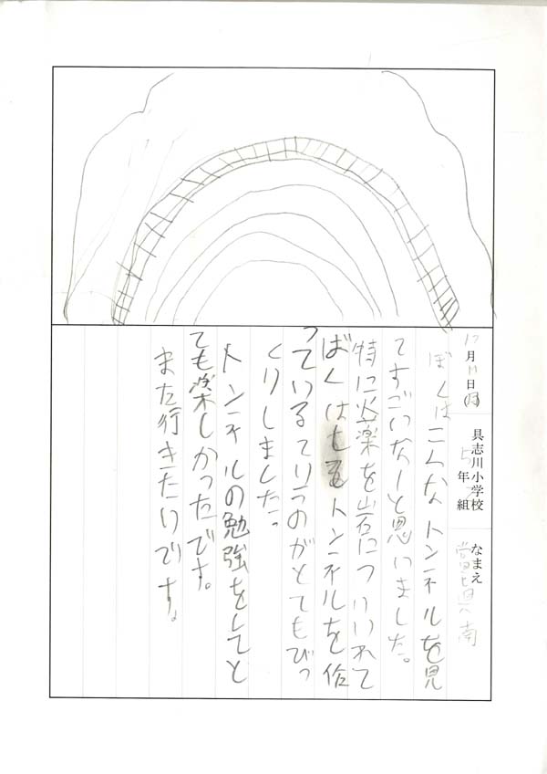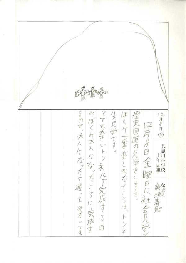 具志川小学校のみなさん、楽しい絵日記をありがとうございました!みんな、それぞれ心に残ったことは違いますが、やっぱり「名護東道路1号トンネル」の絵を書いてくれているお友達が、1番多いですね!みんなが大人になる頃に完成するトンネルです。大人になって完成したトンネルを車で走りながら、この見学会のことを思い出してくれたら、うれしいですね。