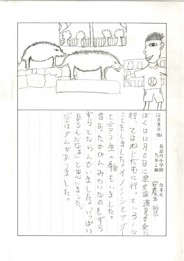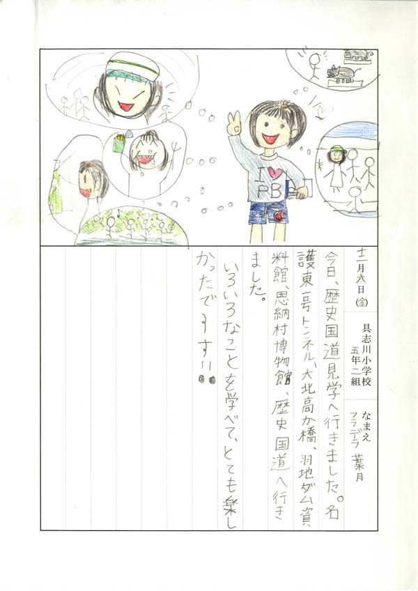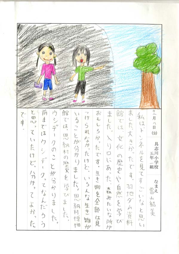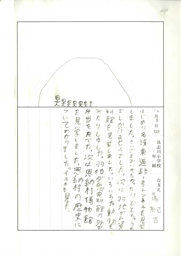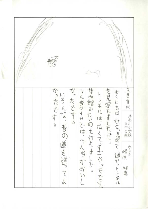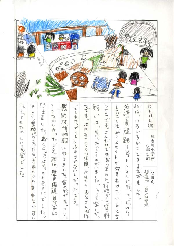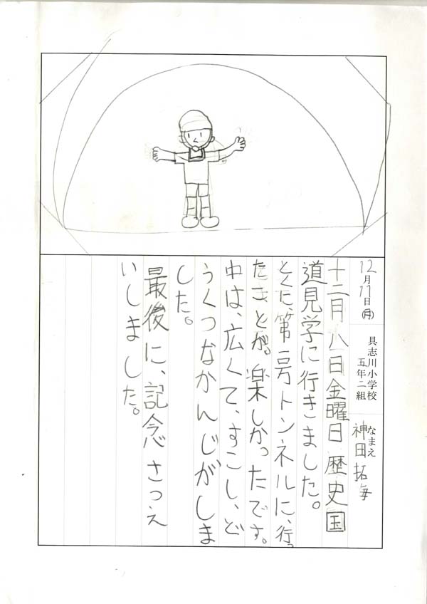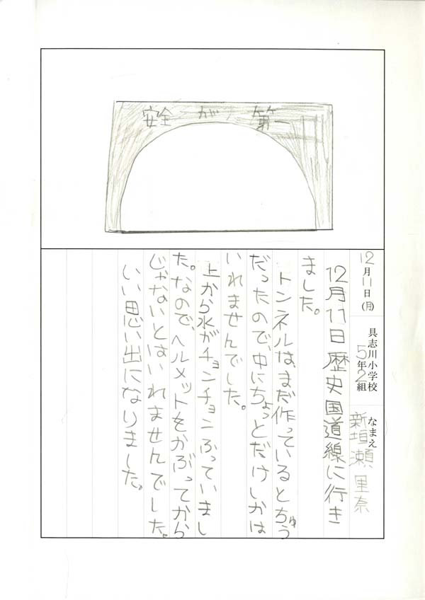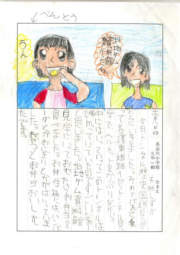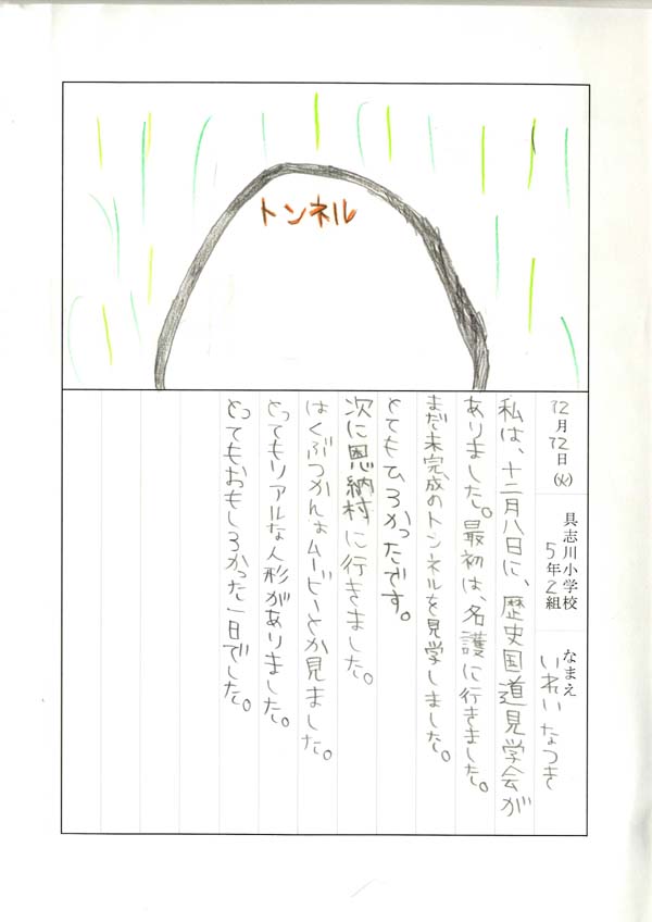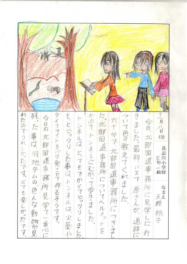 具志川小学校のみなさん、楽しい絵日記をありがとうございました!みんな、それぞれ心に残ったことは違いますが、やっぱり「名護東道路1号トンネル」の絵を書いてくれているお友達が、1番多いですね!みんなが大人になる頃に完成するトンネルです。大人になって完成したトンネルを車で走りながら、この見学会のことを思い出してくれたら、うれしいですね。