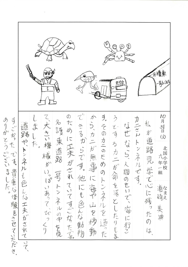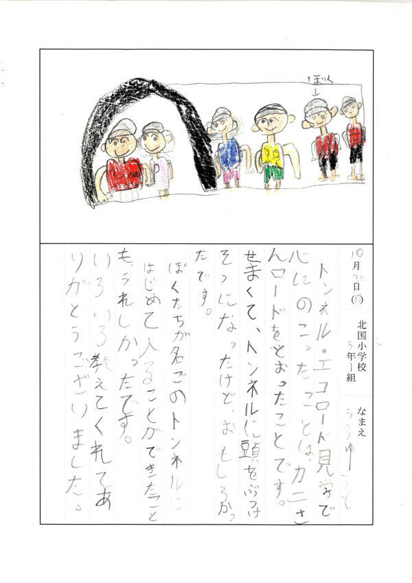 トンネル・エコロード見学で心にのこったことは、カニさんロードをとおったことです。せまくて、トンネルに頭をぶつけそうになったけど、おもしろかったです。ぼくたちが、名ごのトンネルにはじめて入ることができたこともうれしかったです。いろいろ教えてくれてありがとうございました。 |