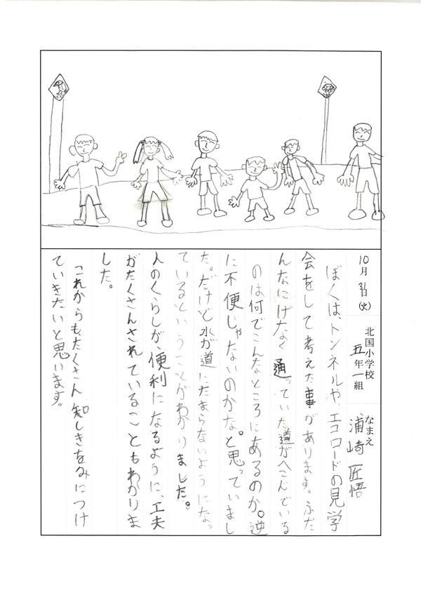 ぼくは、トンネルやエコロードの見学会をして考えたことがあります。ふだんなにげなく通っていた道がへこんでいるのは何でこんなところにあるのか。逆に不便じゃないのかな。と思っていました。だけど水が道にたまらないようになっているということがわかりました。人のくらしが、便利になるように、工夫がたくさんされていることもわかりました。これからもたくさん知しきをみにつけていきたいと思います。 |