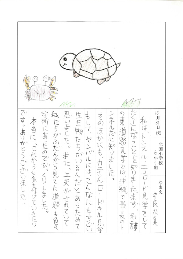 私は、トンネル、エコロード見学をしてたくさんなことを知りました。まず、名護の東道路見学では、沖縄で最長のトンネルだと知りました。そのほかにも、カニさんロードキル見学もして、ヤンバルには、こんなにもすごい生き物たちがいるんだとあらためて思いました。また、工夫がされていて私たちがふだんから見ていた道路も色々なところにあったのでびっくりしました。ほんとに、これからも気を付けていきたいです。ありがとうございました。 |