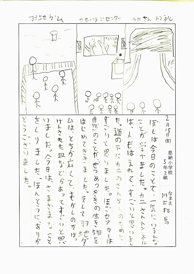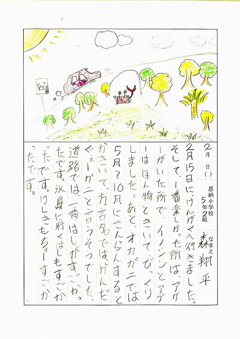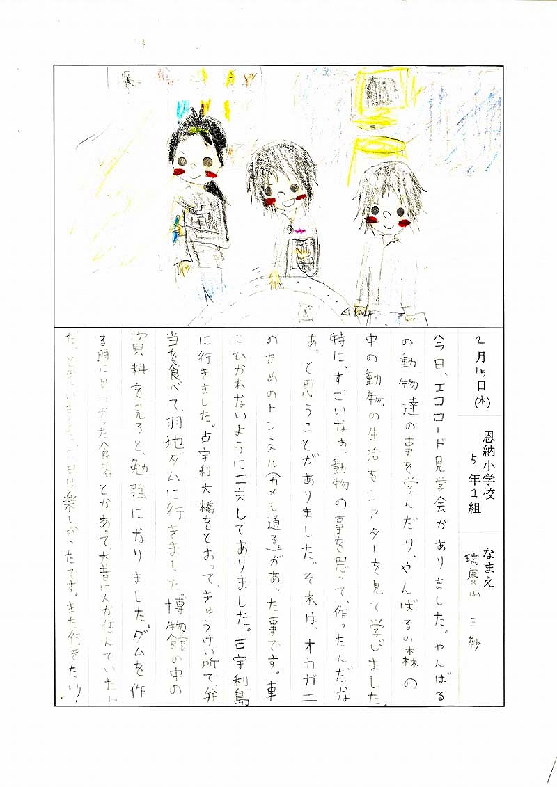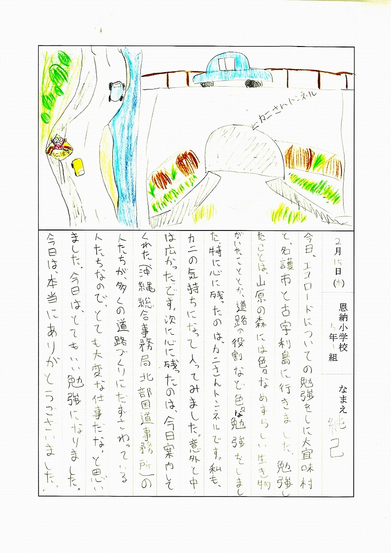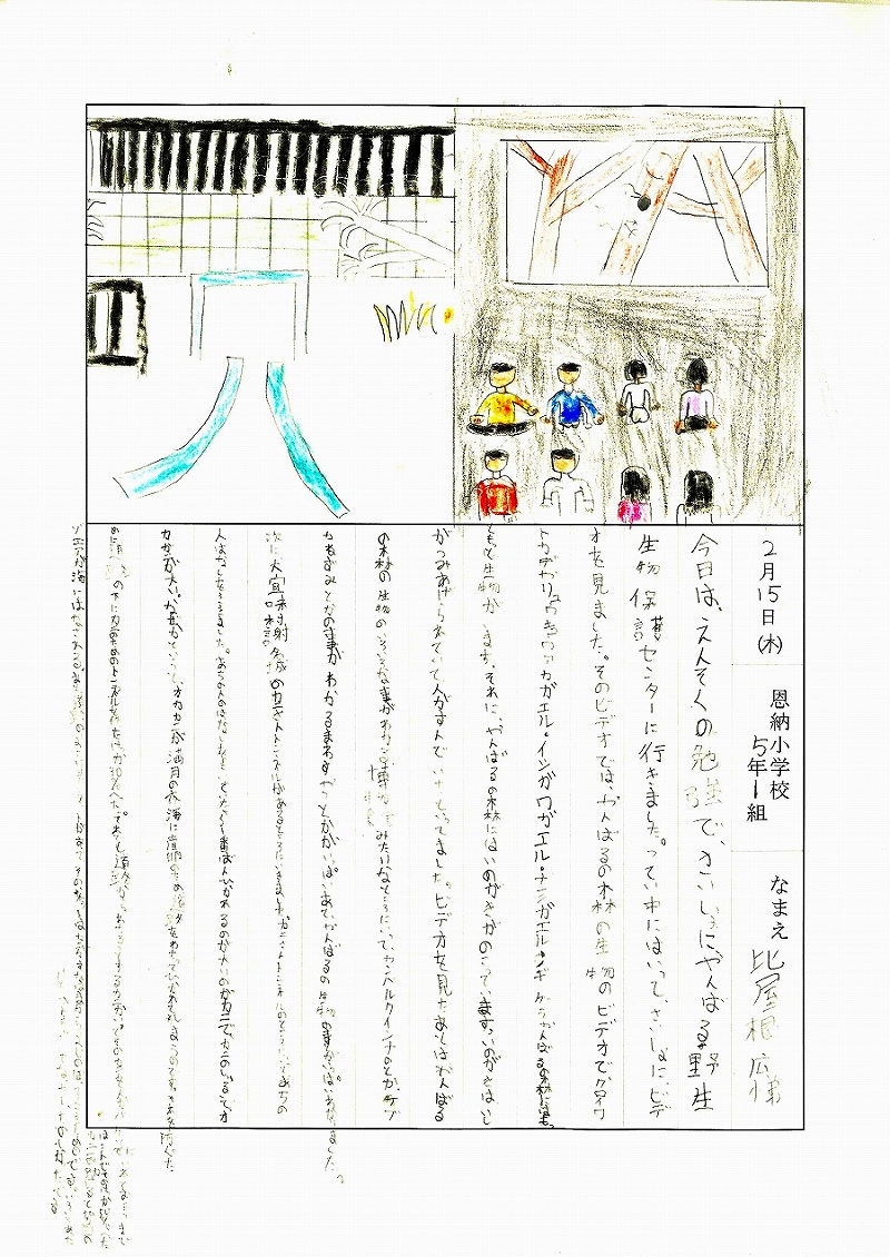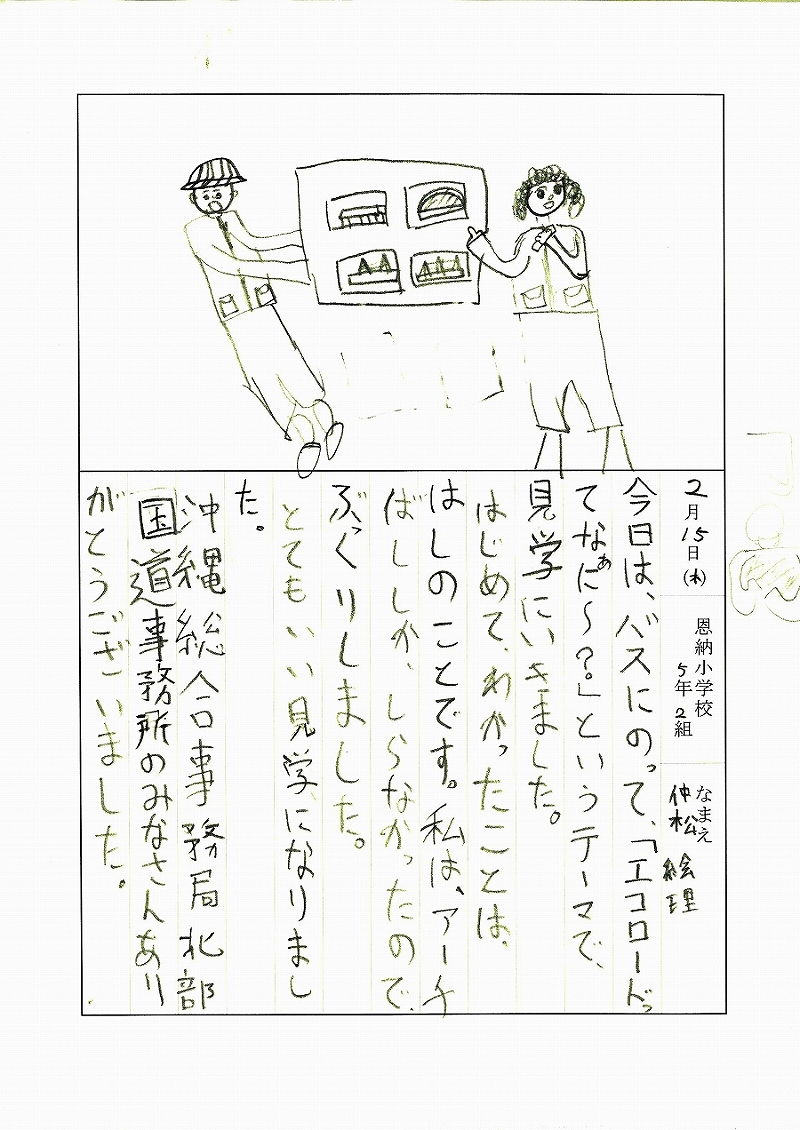 恩納小学校のみなさん、楽しい絵日記をありがとうございました!感想文を読むと、この見学会で色々なことを楽しみながら学んでくれたんだなぁって、よくわかってうれしかったです!みなさんは、もう6年生になっていますよね。見学会で学んだことを忘れず、最上級生として頑張ってくださいね!