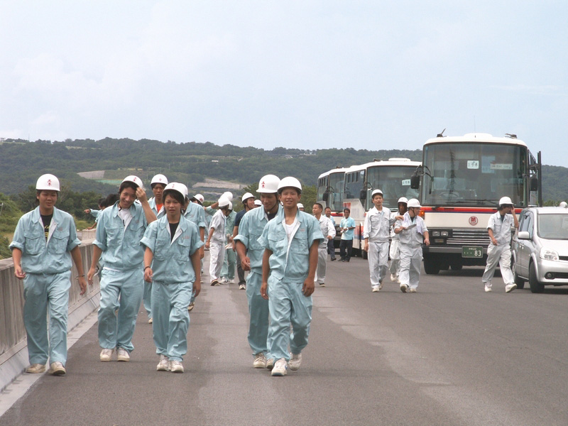 平成22年7月9日(金)、沖縄県立沖縄工業高等学校 土木科1年生〜3年生の生徒108名を対象に、名護東道路のトンネル工事現場見学会が行われ、名護東道路の概要説明や、貫通した1号トンネル、2号トンネル 内に入り、工事担当者から工事の施工法や進歩状況などの詳しい説明を受けました。