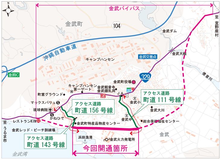 平成23年3月30日に金武バイパスの一部区間が開通しますが、国道329号現道区間に直接接続しないため、通行の際には、町道を通じてのアクセスが必要となりますので、利用の際はご注意ください。
