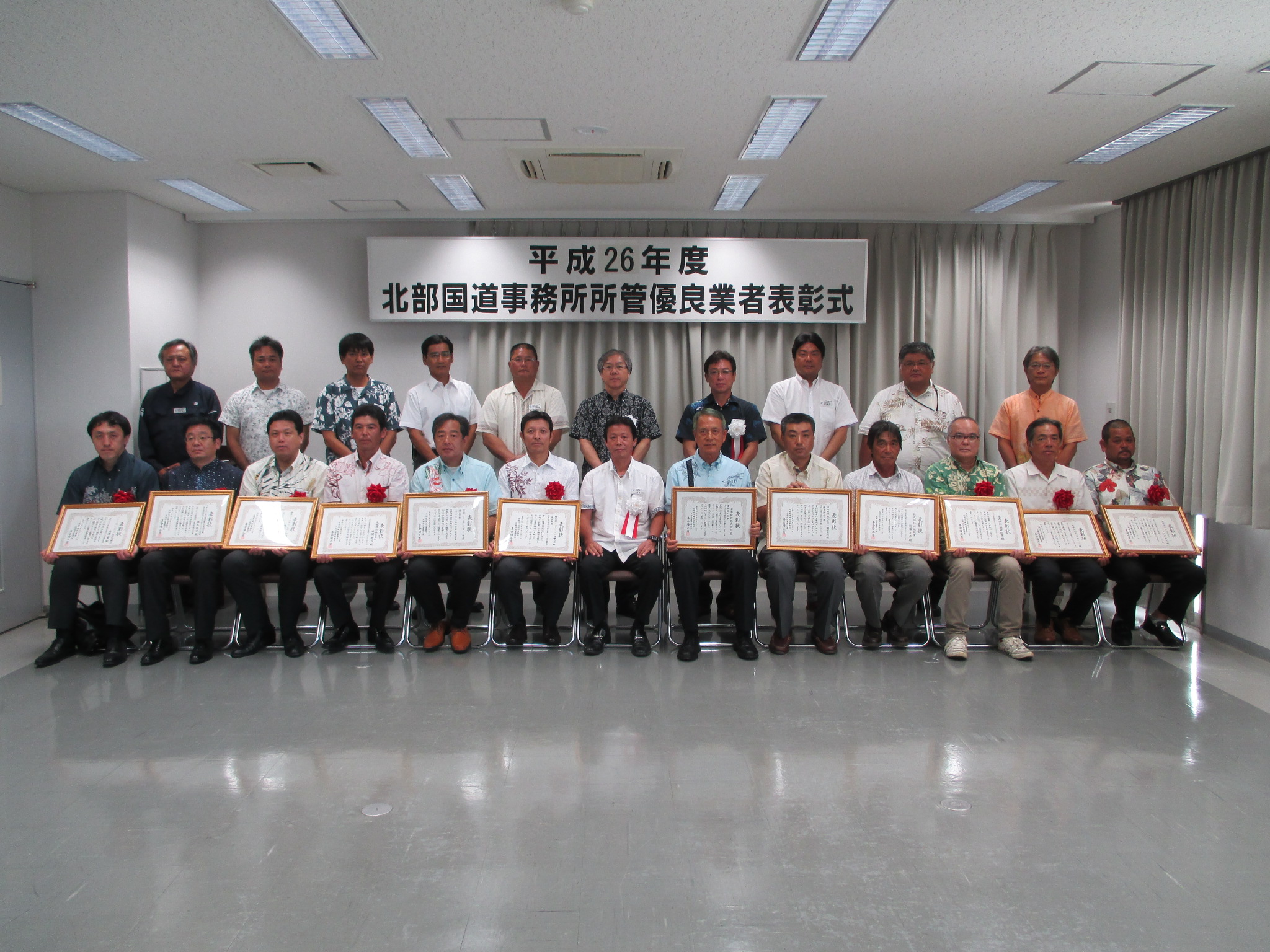 当該表彰は当事務所所管事業の円滑な推進と技術の向上を目的としており、平成26年度に完成又は完了した工事及び業務の中から優良施工工事2社、優良業務2社、優秀工事技術者1名、優良業務技術者3名を特に優秀と認め、他の業者・技術者の模範となり推奨に値するものとして事務所長表彰としたものです。また、優良な工事において、品質の確保・向上に特に貢献したと認め、優良下請業者2社、優秀下請技術者2名をも併せて北部国道事務所長表彰としています。