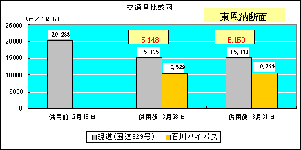 - 石川断面の現道交通量は供用翌日、1,473台/12h(約8%減)、4日後2,370台/12h(約13%減)減少し、現道交通量の削減効果がみられる