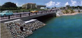 旧恩納橋は、一般国道58号の恩納村恩納の万座毛入口交差点に位置し、昭和30年(1955年)に完成しました。しかし、近年、老朽化に伴い平成14年度に架け替え工事に着手し、平成14年10月28日から仮橋により交通切り回しを行ってまいりました。このたび取り付け部工事の一部を残して、平成15年9月27日に橋梁本体が完成することにより、10月1日に本橋への車線切替えを行います。