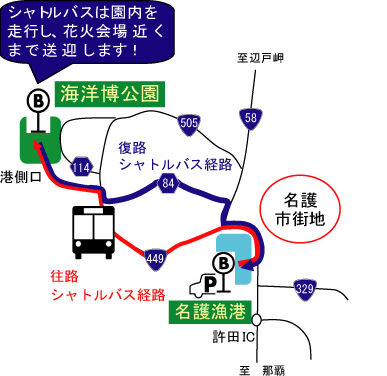 なお、シャトルバスの定時走行を図るため、白銀橋(東)交差点、本部大橋交差点等では円滑な交通のために対策を行います。 さらに、当日は名護漁港において、P&BR利用者向けにイベント開催(フリーマーケット等;検討中)を予定しています。