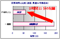 P&BR利用者の時間短縮 P&BRバスを利用した人は、一般の方(マイカー利用者)と比較すると、2時間11分も時間短縮となりました。