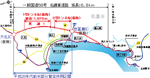 名護東道路は名護市大北から同市数久田までの6.8km(4車線)の道路です。そのうち、名護市大北から同市世冨慶までの4.2km(2車線)について平成20年代前半の開通を目指しております。今後は2号トンネル(仮称)、大北インターチェンジ(仮称)、世冨慶インターチェンジ(仮称)等の工事を行っていきます。 |