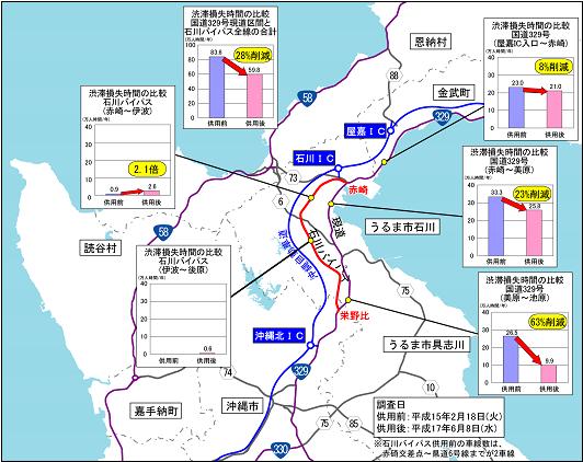 1.2 整備効果 石川バイパスの開通により、国道329号現道部の交通量の削減、旅行速度の向上が見られ、渋滞損失時間(渋滞の激しさを表現した指標)及びCO2排出量(二酸化炭素排出量)の削減効果が現れており、渋滞緩和に大きく貢献しています。 また、市街地を通過していた交通が石川バイパスに転換したことにより、騒音・振動の低減や排気ガスの減少等沿道環境の改善にも寄与していると考えられます。 (1)交通量の変化〜国道329号石川市街地部の交通量が減少〜 国道329号現道区間の昼12時間交通量はバイパス供用後、減少傾向にあります。 うるま市石川で18,807台から14,571台へ、うるま市石川東恩納で20,283台から12,282台へ、それぞれ23%、39%減少しています。また、バイパスと現道を結ぶ県道6号線石川伊波の交通量も34%減少しています。