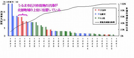 図 石川バイパス供用前後の二酸化炭素排出量の変化 2.北部地域全体におけるうるま市石川市街地の渋滞発生状況 北部地域にある国道(直轄国道:国道58号、国道329号)の渋滞状況(石川バイパスパス開通後)を見ると、うるま市石川市街地部の渋滞は、地域内の上位を占めており、渋滞の激しい地域と言えます。つまり、石川バイパス開通によりうるま市石川市街地分の渋滞が緩和されたものの、渋滞解消までには至らず、依然として渋滞が発生している状況にあります。