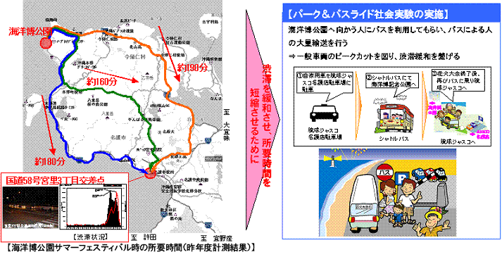 毎年開催される「海洋博公園サマーフェスティバル」では、花火大会が終了すると8,000台近い車が一斉に帰宅するため、交通集中が原因で名護市や本部町において、著しい交通渋滞が発生。