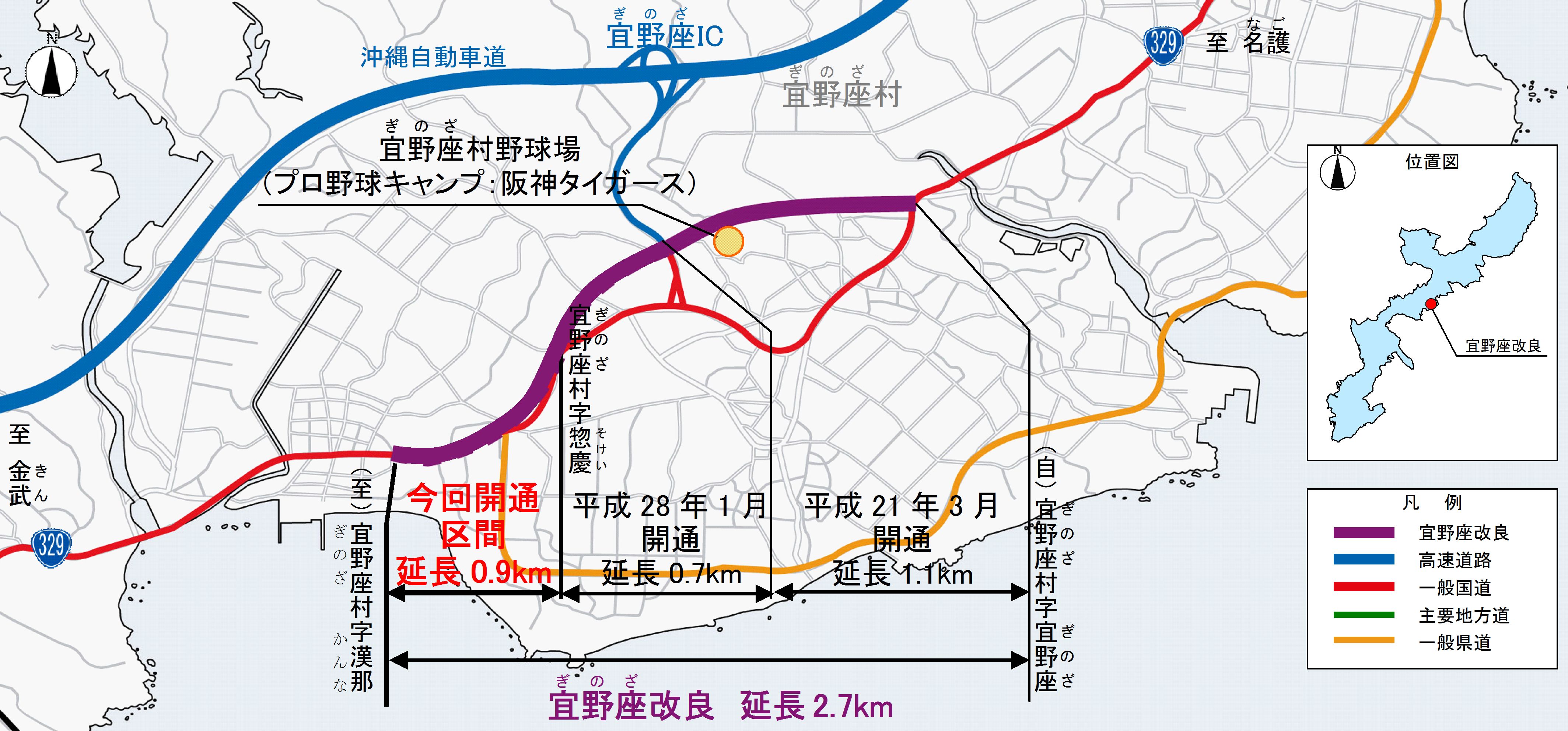 このたび、国道329号宜野座改良は宜野座村字惣慶〜同村字漢那(延長0.9km)区間の開通により、全線開通(延長2.7km)となりますのでお知らせします。 ■開通内容 @路 線 名 :国道329号宜野座改良 A区 間 :宜野座村字惣慶〜同村字漢那 延長0.9km ※全線区間:宜野座村字宜野座〜同村字漢那 延長2.7km B開 通 日 :平成28年3月31日(木) C開通内容:2車線開通 D国道329号宜野座改良の概要 宜野座改良事業は、連続する線形不良箇所(最小曲線半径:現道区間61m、宜野座改良区間160m)や信号機を回避するルートが形成されるとともに、国道329号現道の交通が宜野座改良に転換することで、幹線道路の走行性と現道の安全性の向上に寄与します。また、先立って行われた部分開通により、プロ野球春期キャンプ期間中の渋滞が大幅に緩和しました。 開 通 前:(H21.2) 区間最大渋滞長 1,950m 部分開通後:(H28.2) 区間最大渋滞長 0m また、今後、地域の骨格となる街路の形成により、定住人口の増加など地域の活性化に貢献することが期待されます。 (詳細は別紙資料参照) |