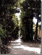 名護から西へ国道505号を走ること約40分、本部半島の先端で「備瀬のフクギ並木」と呼ばれる、沖縄本島最大規模のフクギの並木に出会えます。まっすぐな路地が交差する碁盤の目のような集落のなかで、強い太陽光線が心地よくさえぎられ、おだやかな風が吹き抜けます。約250戸の住宅を囲むフクギの屋敷林は、どの木も樹齢300年以上。その数は数千本に及ぶそうです。