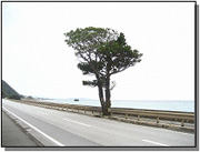 40年ほど前、ここの海岸線には防風林として数多くの木々が生い茂り、そのなかには松や桃もたくさん見られたということです。行き交う人々は、村境のこの木の下で腰をおろし休息をとったのだとか。濃い木陰は、夏の陽射しからの格好の避難所でした。やがて道路拡張のための伐採がすすみ、おおよそ20年ほど前には、この2本の木だけになっていたそうです。眼下には、県指定の名勝、天然記念物の板干瀬(いたびせ)がひろがっています。年老いた「共立ちの木」は、最近甦生手術を受けました。防風林の最後の生き残りに、私たちはいつまで出会うことができるのでしょうか。