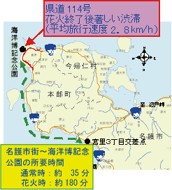 ◆海洋博記念公園における花火大会開催時には、交通の一極集中が要因となり、名護市街−海洋博記念公園間の所要時間が通常時の5倍以上(通常時:約35分→花火大会時:約180分)に増加します。