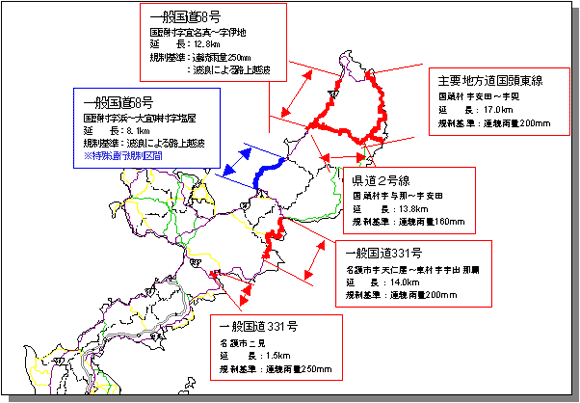 北部地域では、以下にあるように、台風や集中豪雨時などによる異常気象時において、道路の損壊、落石、土砂崩れ等の住民の皆様に被害を被る可能性がある区間を、『異常時通行規制区間』と定めており、規制基準を超えた場合には、通行止めや通行注意の規制をかけています。