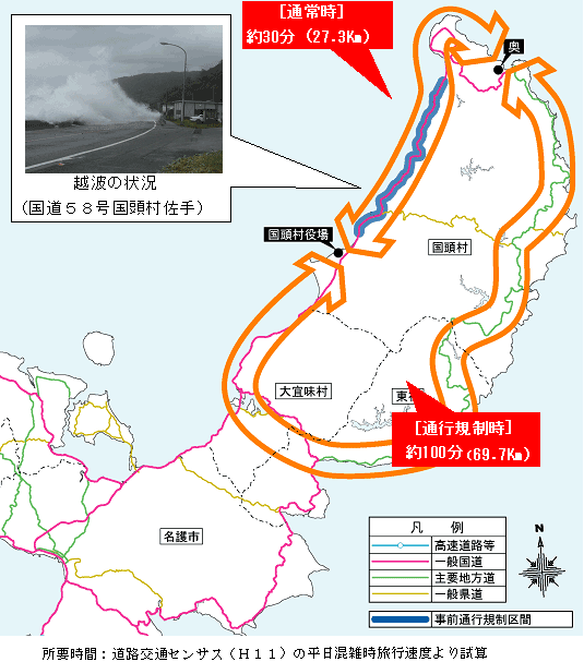 国頭村字奥〜国頭村役場の間は通常、国道58号経由で約30分程度で到達可能ですが、事前通行規制区間が路上越波などで通行止めとなった場合、大幅な迂回を強いられることとなるため、通常時の3倍以上の時間を要する可能性があります。