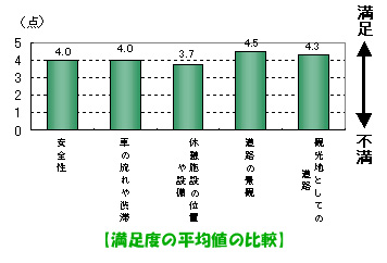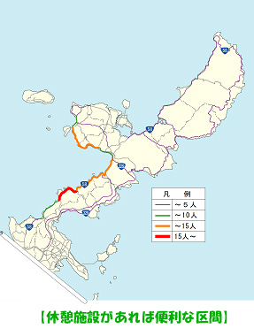 観光客の道路に対する満足度は、休憩施設の位置や設備が最も低い結果になっていて、恩納村や名護市を中心としたリゾート地で休憩施設を求めているね。