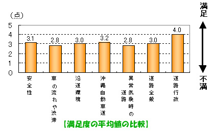 地域住民の道路に対する満足度は、車の流れや渋滞、また異常気象時の幹線道路が最も低い結果になったね。