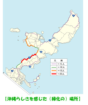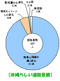ほとんどの観光客は、沖縄らしい道路景観といえば、熱帯の情緒が漂う緑化をイメージするんだね。 また、沖縄らしさを感じる場所は、リゾート地で ある恩納村や本部町だね。