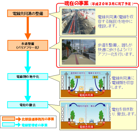 に電線類を収納することで地上にある電柱を撤去 し、安全で歩きやすい道路をつくることです。
