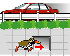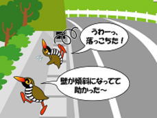 ヤンバルクイナの雛(ひな)などの小動物が溝に落ち、そのまま自力で脱出できずに死んでしまうことがないよう、道路沿い のU字側溝の壁面を緩やかな傾斜にしたり、スロープを整備するなどの対策を行います。