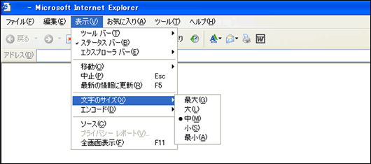 ◆インターネットエクスプローラーを使用している場合 メニューバーの「表示」をクリックし、マウスを「文字のサイズ」の上に移動すると、 「最大」から「最小」まで文字の大きさを選択できます。