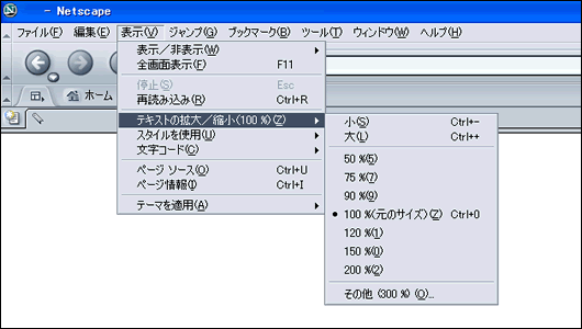 ◆ネットスケープを使用している場合 メニューバーの「表示」をクリックし、マウスを「テキストの拡大/縮小(100%)」の上に移動すると、 「50%」から「200%」まで文字の大きさを選択できます。
