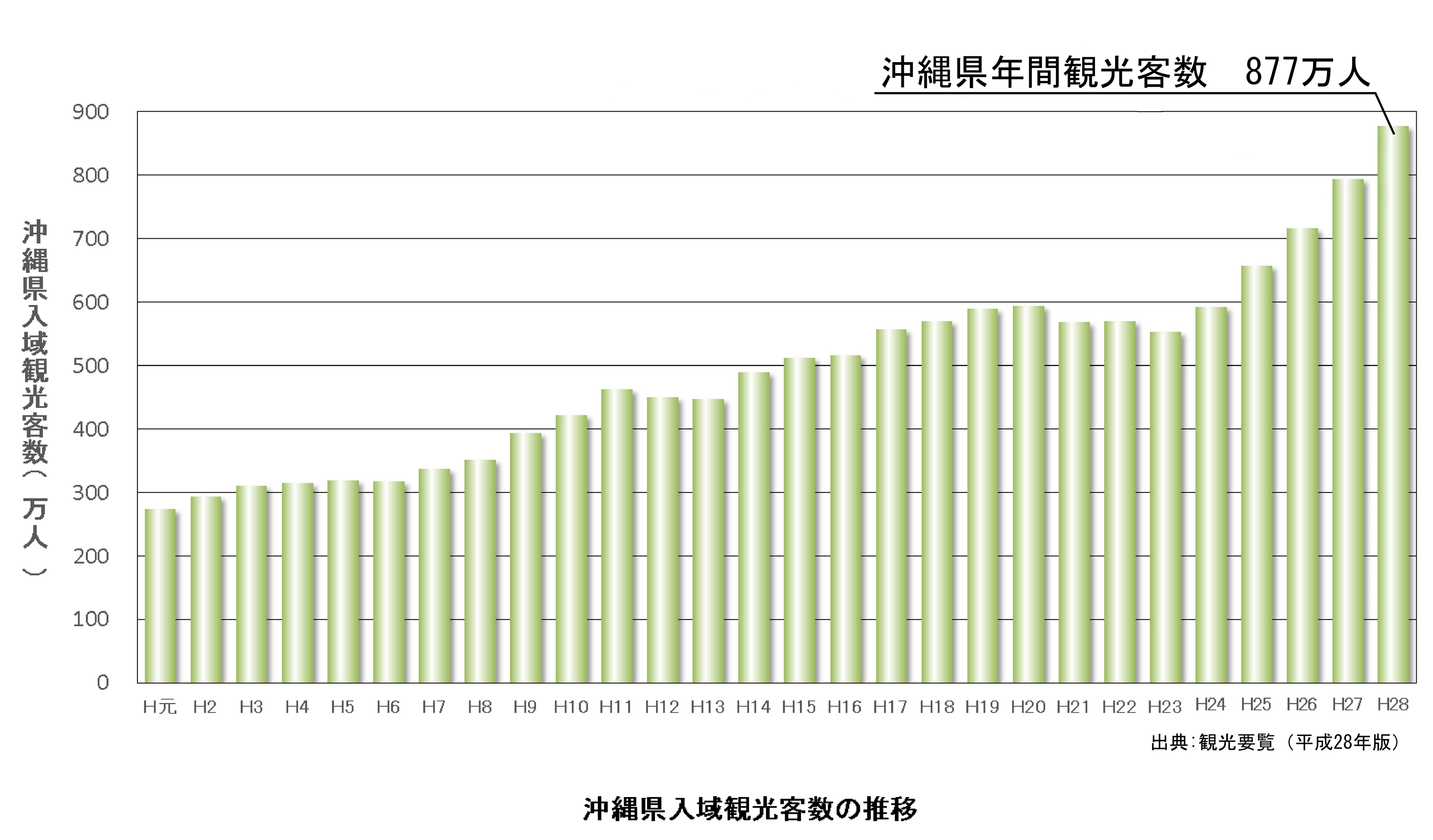 平成28年では、877万人の観光客が沖縄を訪れました。 |