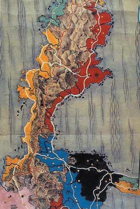| 18世紀に作成された、沖縄本島および周辺離島を描い48.2cm×99cmの極彩色の地図です。各間切、島は、赤・黄・青・藍・緑・桃色などで塗りわけられ、それぞれの間切・島の頭文字が記されています。[沖縄県立図書館] |