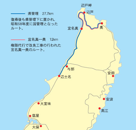 日本に復帰した沖縄を 象徴 ( しょうちょう ) するものとして、国道58号の起点が挙げられます。それまで軍道として沖縄内にとどまっていた1号線は、一般国道に指定され、復帰後の特例として海を越えて鹿児島市に起点を持つこととなりました。現在のルートを起点から追ってみると、国道が海を越えて沖縄を走っていることがよく分かります。 国道五八号は鹿児島市山下町をスタートし、その後わずか七百メートルで海に突き当たります。五八号は海上の道なき道となり、種子島へ上陸。島を縦断したのち再び海へ戻り、奄美大島に到着します。 笠利 ( かさり ) 町から瀬戸内町古仁屋の75キロを 駆 ( か ) け 抜 ( ぬ ) けた58号は、沖縄に向けて再び海に出て、沖縄本島を 目指 ( めざ ) します。国頭村奥に上陸した国道は、本島を南下し、那覇市・明治橋の終点へ向かうわけです。 58号の総延長は256キロ、洋上部分を含むと約800キロにも及ぶ、沖縄と本土を結ぶ道なのです。