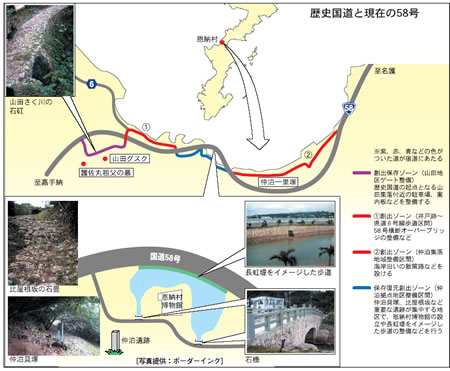 やんばる国道今むかし 王府時代の道 近代沖縄の道 琉球政府時代の道 復帰後の道 21世紀の道 やんばるの伝説を訪ねて やんばるの文化碑めぐり 道に関する方言名 探索ガイドなるほどマップ