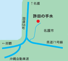 若い侍はそれでも諦(めきれずに何度も頼むと、やがて娘は恥(ずかしそうに、その侍に樋川の水を両手で差し上げました。首里から帰ってからも、その侍は許田の手水の娘のことが忘れられず、とうとうその娘を首里に呼んで妻にしたと伝えられています。