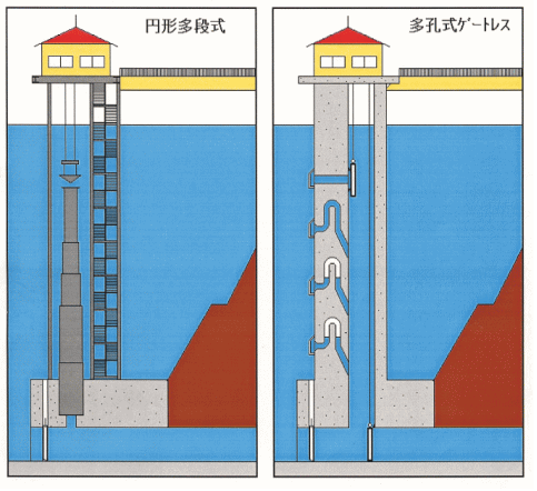 取水量が少なく温度躍層が深いダムでは、連続的な任意層での取水を必要としない為、多孔式の取水設備が可能であり、更に新技術として鋼製の取水ゲートの代わりに逆U字管上部(取水管)に圧縮空気による空気だま りを形成し止水する空気ロック式のゲートレス多孔式取水設備を採用し、 建設・維持管理コストの縮減を図った。