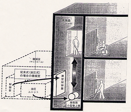 バリアフリー対策の充実のために低層庁舎に設置するエレベーターとして、従来の油圧式エレベーターに代えてマシンルームレス型エレーベーターを採用することにより、従来の油圧式に必要な機械室が不要となりまた、設備においても油圧シリンダーから巻上機のみの簡単構造となり、約9百万円(約38%)のコスト縮減が図れました。