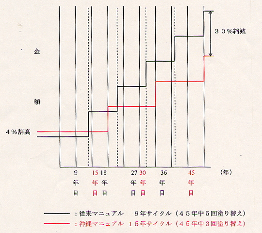 沖縄における鋼道路橋の合理的な維持管理のため、塗装厚、塗布回数のマニュアルを策定しました。それにより塗り替え期間が伸び、約1億6千万円(約30円)のライフサイクルコスト縮減が図れました。