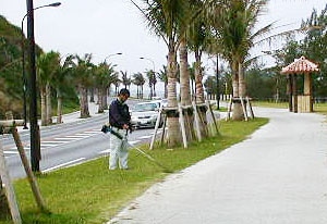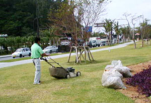 | 実施団体からのメッセージ 私達は平成12年に行われた、九州・沖縄サミットの会場となりましたザ・ブセナテラスホテ ルのアクティビティー部門ガーデンチームです。私達がボランティアに参加している場所は、沖 縄県名護市の玄関といわれている国道58号沿いにありますホテル入口の緑地帯約3,000u、主 に芝地部分の管理(潅水、芝刈、除草、清掃)を行っています。参加初期の頃は、行楽シーズン になりますと芝地にマイカーが乗り上げられデコボコにされ、枯れ状態にされることもしばしば ありました。又空き缶、ゴミ等の放置も多数ありました。作業を行うにつれ、私達の願いが通じ たのか、徐々に乗り上げ、ゴミ放置などが減少したように思われます。 |