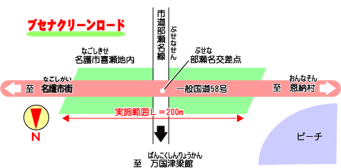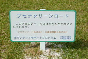 | 経緯/特徴 国道58号名護市部瀬名交差点の線形改良により、旧道路敷の残地を緑地帯として整備し、国 で管理を行っていたが、実施団体より、「リゾート施設の入口にあたるので、よりレベルの高い 管理を行いたく、又地域に貢献するとともに、企業イメージを向上させたい」との申し出があっ たため、協定を締結し活動することになった。 愛称名については、初の地方開催で平成12年、九州・沖縄サミットの主開催場となった、名護市部瀬名岬の地名と、活動場所が常にきれいになり、ここにおとずれる方からも親しまれることを願い、「ブセナクリーンロード」と決めた。 本活動場所は、先の九州・沖縄サミットの主開催場となった万国津梁館やビーチ、リゾートホ テルが整備されている、部瀬名岬への入口となっています。道路利用者のみならず、それら施設 利用者すべての方に親しまれるよう活動している。 |