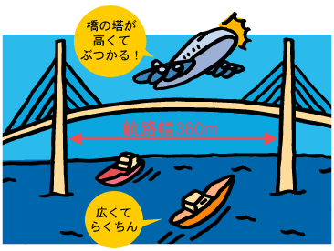 海底トンネルをつくる那覇ふ頭は大きな船が通るから、普通の橋のような柱の間が狭い橋はダメなんだ。だからといって、柱の間が広くとれる高い塔を建てる橋をここに架けると、隣の那覇空港の飛行機の離着陸のじゃまになっちゃうから、橋は架けられないんだ。また、地中を掘ってトンネルをつくるとトンネルの長さが長くなっちゃうんだ。そうすると、工事の費用や時間がかかって大変なんだ。だから、トンネルの函を海底に沈める形式のトンネルをつくることになったんだ。これが沈埋トンネルと言うんだよ。