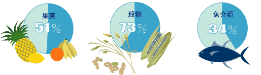 我が国で一年間に消費される食料品のうち、約60%が海外からの輸入品です。 例えば、伝統的な日本の味であるしょう油や味噌、豆腐などの原料となる大豆は、その95%以上が輸入されています。私たちの食卓にのぼる多くのものが海外から輸入されたものを原料としているのです。
