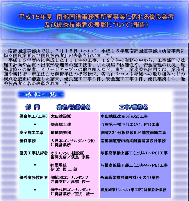 平成15年度 南部国道事務所所管事業に関わる優良業者及び優秀技術者の表彰について |