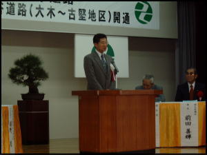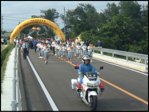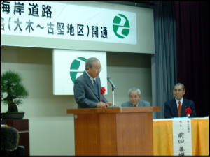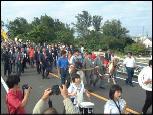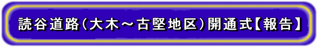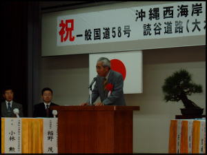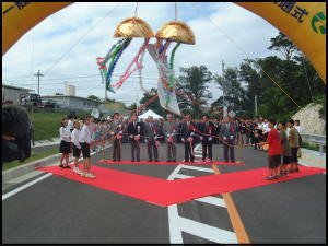 | 平成15年4月16日(水)15:30に読谷道路(大木〜古堅地区:1.3km)の開通式が大木公民館にて開催されました。 開通式には、安田慶造読谷村長、中部振興会会長の宮城篤実嘉手納町長を始め多くの参加者の出席のもと開催されました。 開通式後には、テープカットとくす玉開被のあと、古堅中学校吹奏楽部の先導で通り初めを行った後、17:00から供用開始されました。 |