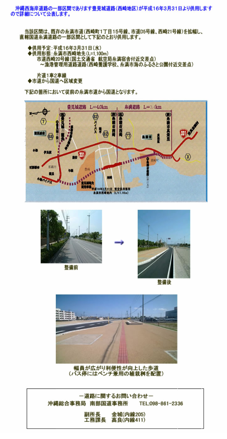 | TOP/トピックス・記者発表/平成16年度掲載記者発表「沖縄西海岸道路【豊見城道路(西崎地区)部分暫定供用L=1.1km】供用開始について」 |