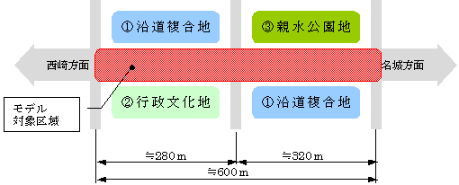 | ・ | 周辺土地利用は以下のように計画されています @沿道複合地区−沿道型商業、都市型住宅 A行政文化地区−新市庁舎、市民ホールなど B親水公園地区−レクリエーションの場 |