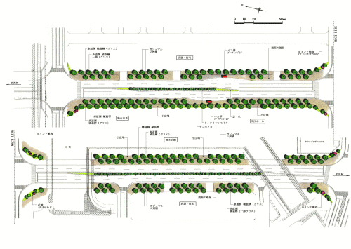 中央分離帯は水中めがねの材料として糸満になじみの深いモンパノキを植栽し、アクセントとして6m間隔に車道建築限界内で自然樹形を維持する事が出来るトックリヤシモドキを植栽する。 |