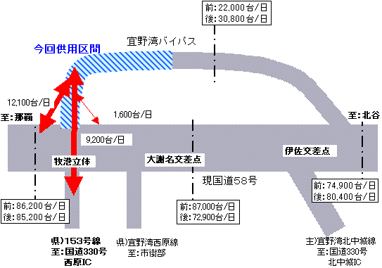 | バイパスの日あたり交通量が約2.2万台から3.1万台に40%増加し、牧港立体交差点で出入りするバイパス利用交通量の40%は国道330号から県道153号線を介しての利用があり、